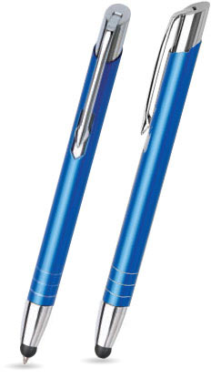 Metallinen kosketusnöyttökynä, jossa myös tavallinen kuulakynä.